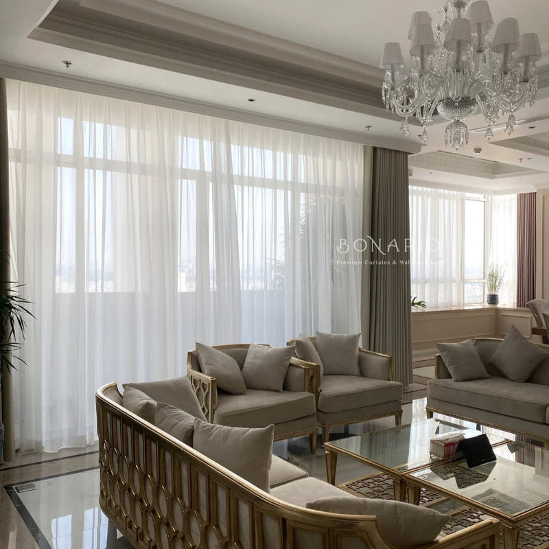 Rèm vải hai lớp kết hợp giữa vẻ mềm mại của lớp voan mỏng và sự cản trở ánh sáng từ lớp vải dày, tạo nên sự tinh tế và đa dạng cho không gian. Khi mở lớp voan, căn phòng sẽ tràn đầy ánh sáng nhẹ nhàng; khi kéo lớp vải dày, không gian trở nên ấm áp và riêng tư.